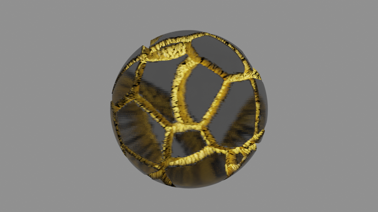 The glass sphere was broken, however, it was repaired with Kintsugi, so it became unique.Kintsugi, a traditional Japanese technique for fixing ceramics (it traces the cracks with pure gold powder), which shows an ‘Acceptance philosophy’ that embraces accidents and believes that ceramics become more beautiful with the cracks they have.