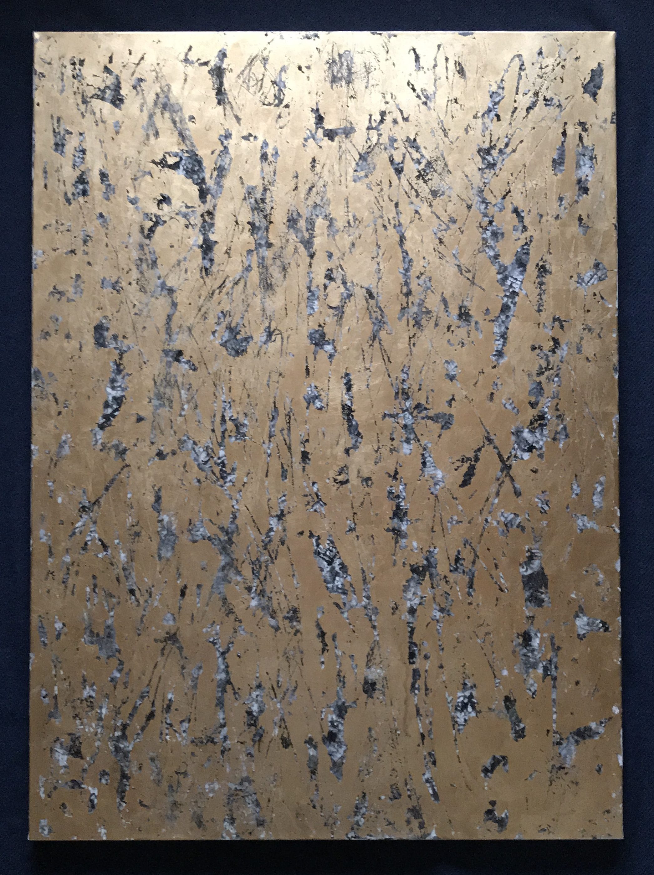 Then I pasted gold foil, which was not real gold, on the paper to show that Japan seemed to be rich but not really that rich. In addition, I removed parts of the foil on purpose to expose the areas that were stamped.